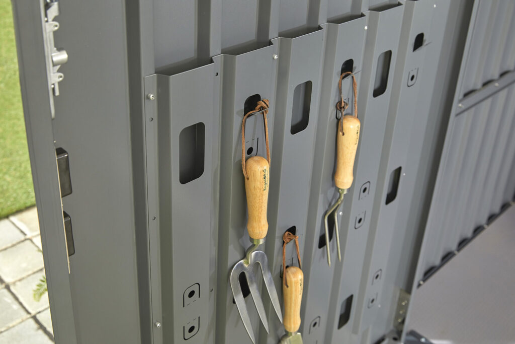 At HEX Living, we believe in making shed organisation as simple as possible. All our secure metal sheds feature an integrated door panel organisation system, perfect for hanging tools and other handheld equipment for easy access. Our sheds also feature two built-in shelves, keeping your items off the floor and out of the way. Robust and sturdy, these shelves are great for bulky items like toolboxes and paint cans and can take your organisation game to another level. These added features are crucial to maximising the storage space available without restricting the cleanliness or tidiness of the space.